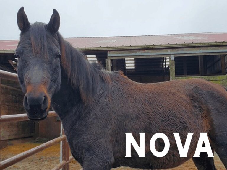 Nova arrived at Skagit Animals in Need in need of care—covered in bot eggs, burrs tangled in her mane and tail, underweight with a body condition score of 3/9, and showing signs of a heavy parasite load. Despite her rough start, she greets us with a friendly whinny each morning and will accept treats and brushing.